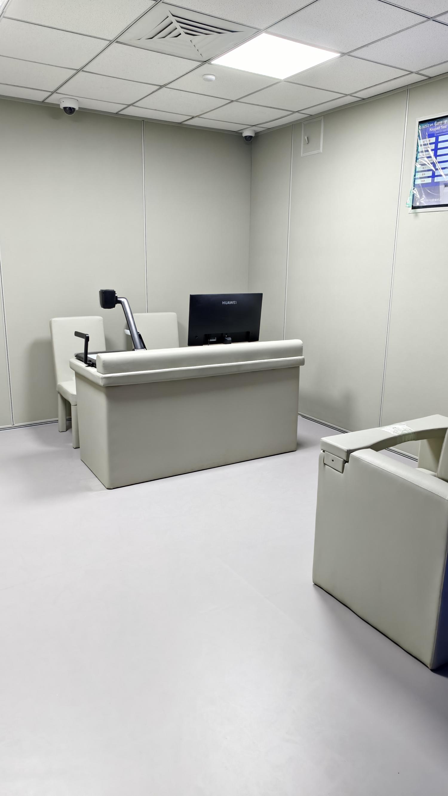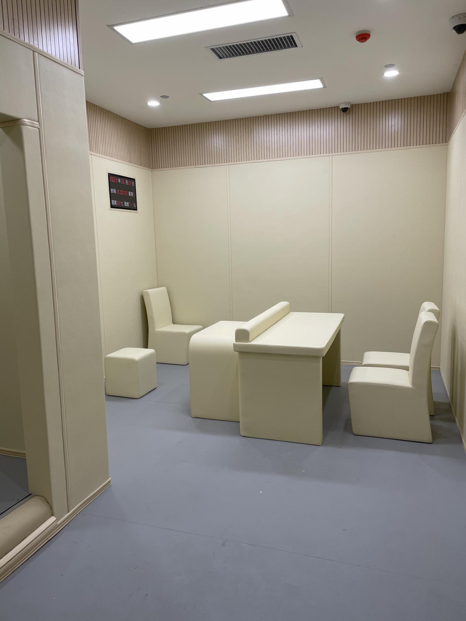 审讯室面积为15-30平方,一般设置2台全景摄像头及1台特写摄像头,1台在线视频系统,通过联网服务器进行远程指挥及同步录音摄像,房间内配备示证视频系统。配备办公和谈话桌椅,办公和审讯桌椅均采用软质包覆,无安全隐患,配备多媒体排口系统,方便办公人员的电器设备,及视频系统。 为进一步防止被审讯人的人身安全,以头撞墙产生以外,墙面应用厚度大于2cm阻燃防撞软体材料进行覆盖,绝对不允许意外事件的发生。室内电器设备安装不规范有可能导致意外事件的发生。因此室内所有的电器设备的电源插座,开关都建议采用集中控制的方式,由电脑控制开关,手动控制器和集线箱应安装在过道或监控房内。为防止意外事件的发生,不建议使用公共卫生间给被谈话人使用。所以每间房间必须有独立的卫生间,所有马桶及洗手盆必须软包处理,并安装隐蔽摄像头。