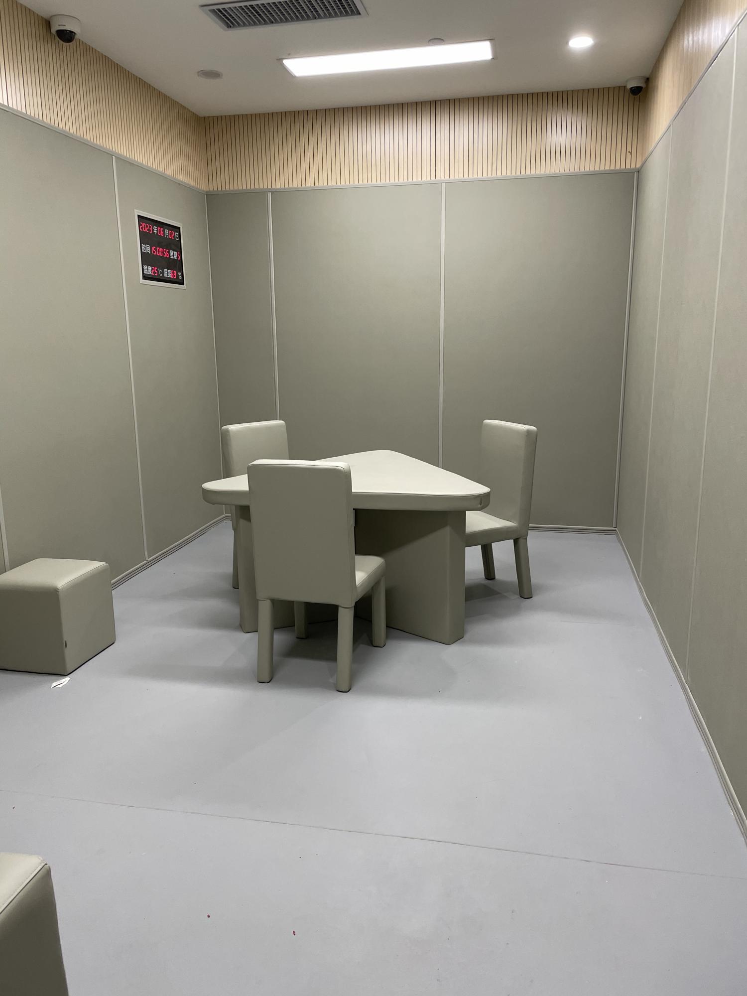 3.完善整墙,一般纪委谈话室等公检法办公室都是3米高的墙,2.4米以下使用防撞墙板满铺,剩余高度我们星美是建议在防撞墙面上安装木质吸音板,不但可以吸音降低室内回音,还可以达到墙面装饰美观的效果,质量好实用性强而且经济实惠。