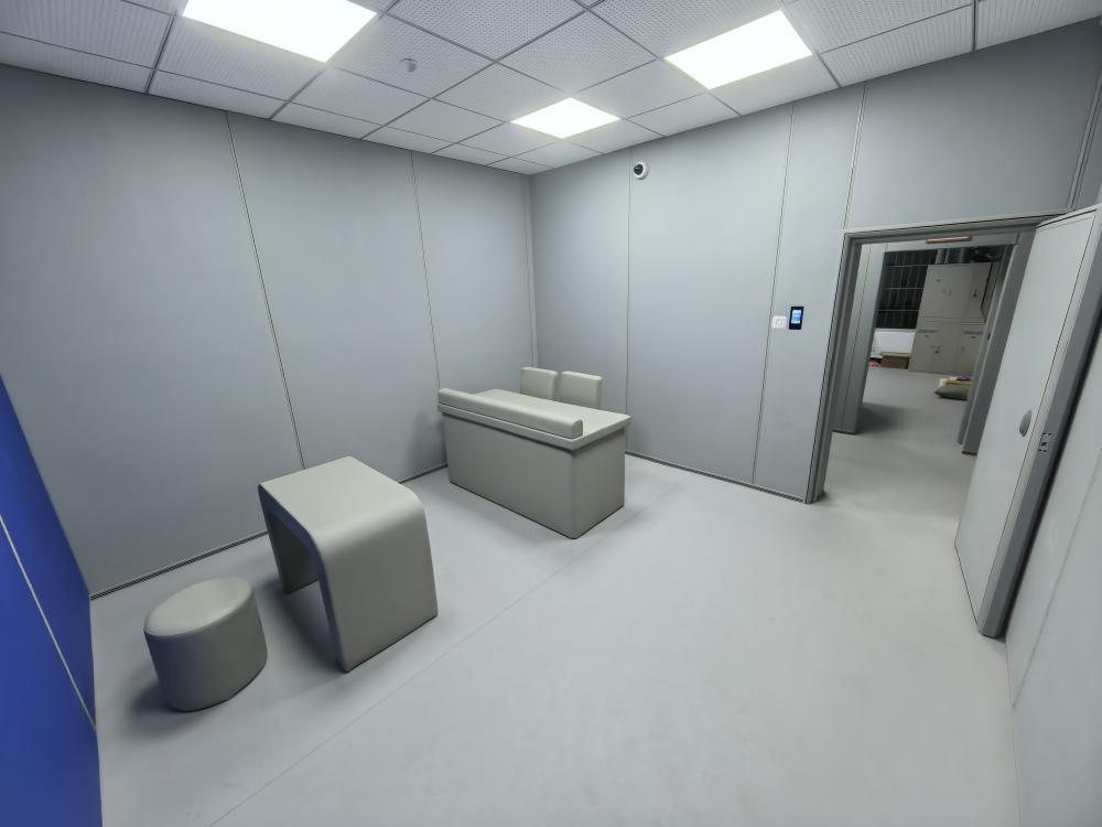 谈话室一般留置的是有重大违法行为的官员,并且是职位较高的。整个谈话室都必须要做防撞处理,而且还要求有隔音效果,材质要环保、阻燃。